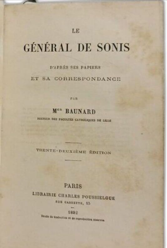 Le général de Sonis d'après ses papiers et sa correspondance ( Louis-Gaston de Sonis) , (La Guadeloupe, la France, le collège - Saint-Cyr, Castres, Paris, Limoges - L'Algérie, la Kabylie - La campagne d'Italie - Le Maroc - Tenez, Laghouat, Saida - Combat de Metlili, une expédition dans le désert - Laghouat, la vie chrétienne - Combat d'Ain-Madhi - Aumale - L'Armée de la Loire, Brou et Loigny - L'ambulance et le congé - Rennes - Saint-Servan - Chateauroux, Limoges - Paris, l'éternité - Appendice)