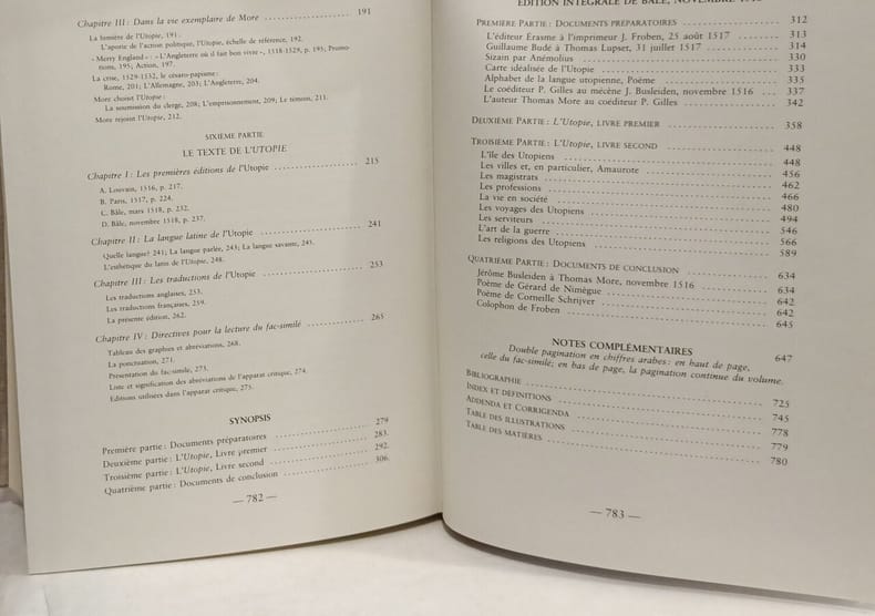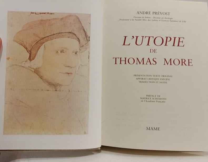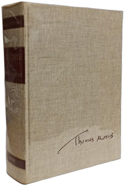 Mame, 1978, fort et gr. in-8°, 784 pp, introduction initiant le lecteur au sens et aux fonctions de l'Utopie. Traduction en regard du texte de More (reproduction de l'édition intégrale de Bâle (novembre 1518) en fac-similé), notes en bas de page et commentaires à la suite du texte, 2 portraits hors texte de More, dont un en couleurs, par Hans Holbein, 6 gravures du temps, biblio, index des matières traitées, définitions des mots techniques, reliure toile de lin écrue de l'éditeur, dos lisse avec pièces d'auteur et de titre basane bordeaux, empreinte de la signature de More au 1er plat, bon état, envoi a.s. d'André Prévost