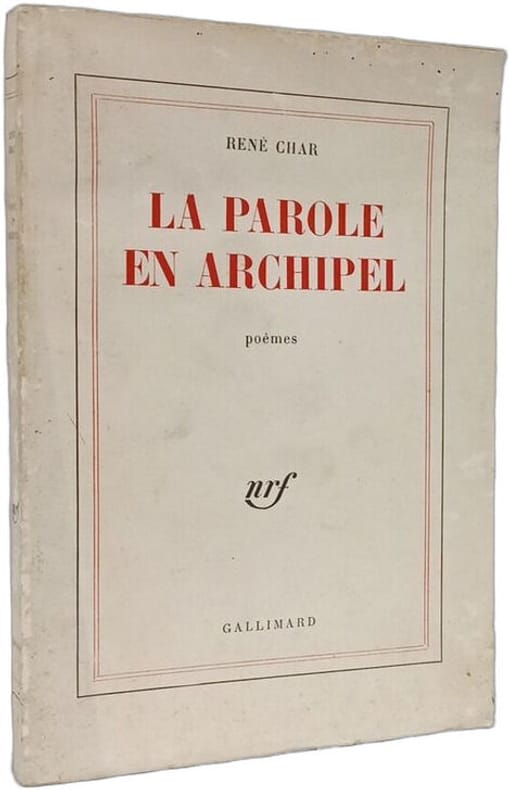 Gallimard 1962 in8. 1962. Broché. La Parole en archipel est un recueil de poèmes de René Char publié en 1962 chez Gallimard rassemblant des textes écrits entre 1952 et 1960. L'œuvre explore une parole poétique conçue comme un archipel d'images et de métaphores tournée vers l'avenir et marquée par une langue dense impersonnelle et commençante où le poète s'appuie sur des éléments naturels