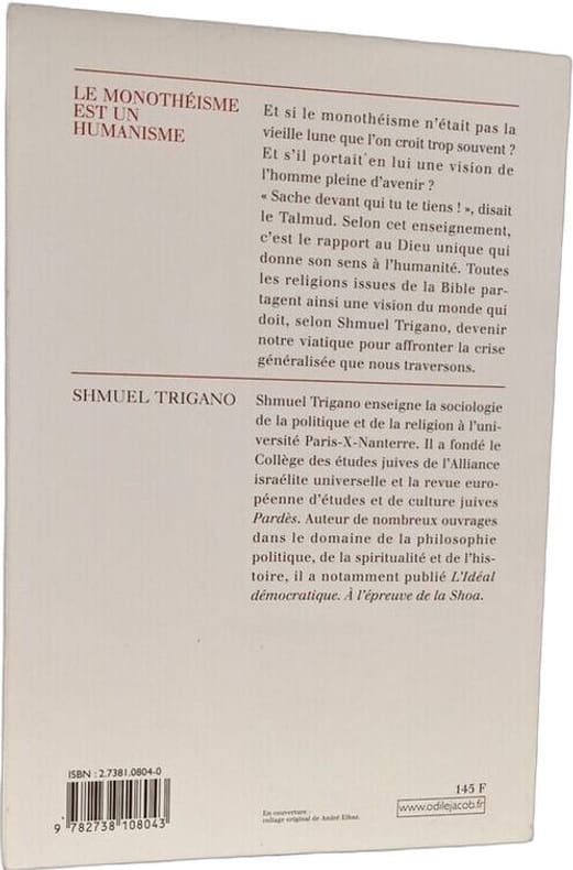 JACOB 2000 199 pages 14 4x21 9x1 5cm. 2000. Broché. 199 pages. Shmuel Trigano défend l'idée que le monothéisme loin d'être dépassé constitue un véritable humanisme. Selon lui le rapport au Dieu unique donne son sens à l'humanité et la vision du monde partagée par les religions bibliques peut servir de guide pour affronter la crise généralisée actuelle