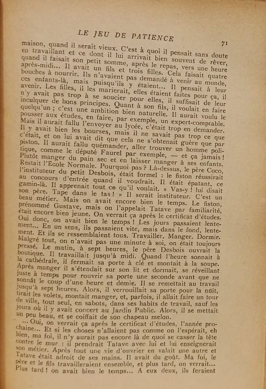 Gallimard 1949 in8. 1949. Broché. Le Jeu de patience est un roman de Louis Guilloux publié en 1949 lauréat du prix Renaudot. Il s'agit d'une vaste chronique qui retrace à travers les souvenirs d'un narrateur humaniste et engagé l'histoire de la ville de Saint-Brieuc et de ses habitants sur près d'un siècle des années 1910 à 1948 en traversant les deux guerres mondiales. Le récit structuré comme un journal mêlant événements contemporains et souvenirs donne la parole aux destins modestes et aux réfugiés notamment espagnols