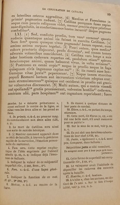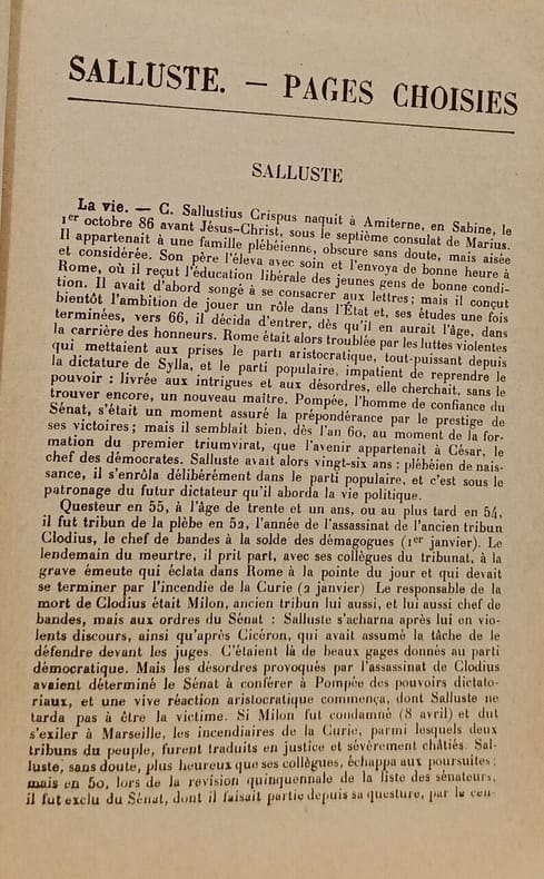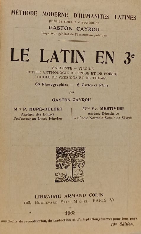 Méthode moderne d'humanités latines, sous la dir. de G. Cayrou, Inspecteur général de l'Instruction publique. Mme P. Hupé-Delort, agrégée de Lettres, prof. au lucée Camille-Sée. Mlle Mestivier, agrégée répétitrice à l'ENS de Sèvres. 1er fascicule, Salluste, versions, et thèmes. 60 photos, 10 cartes et plans. Classification Dewey : 470-Langues italiques. Latin