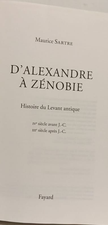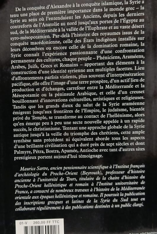 FAYARD 2001 1200 pages 15 2x5 2x23 4cm. 2001. Broché. 1200 pages. Cet ouvrage de Maurice Sartre historien spécialiste du monde grec retrace l'histoire du Levant antique (dans son acception géographique large de la Syrie historique) sur une période de sept siècles de la conquête d'Alexandre le Grand au IVe siècle avant J.-C. jusqu'à la reine Zénobie de Palmyre au IIIe siècle après J.-C. Il analyse les transformations politiques sociales économiques et culturelles de cette région sous les dominations successives des empires achéménide hellénistique (notamment séleucide) et romain
