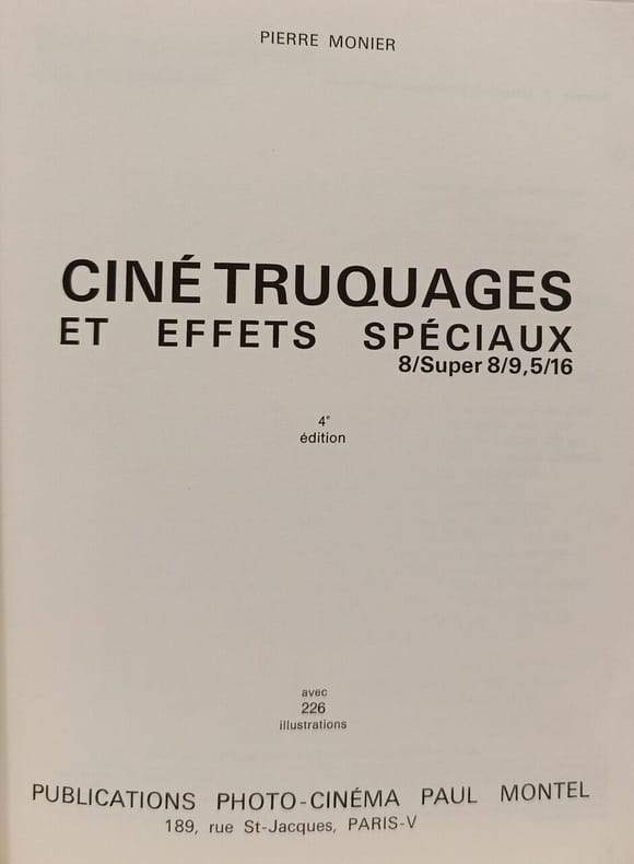 Publications Photo-Cinéma Paul Montel 1979 in8. 1979. Broché. Ce livre technique de Pierre Monier publié en 1971 est un guide pratique dédié aux techniques de trucages et d'effets spéciaux cinématographiques. Il couvre les formats de pellicule 8mm Super 8 9.5mm et 16mm et est illustré par de nombreuses images pour expliquer les méthodes de création visuelle