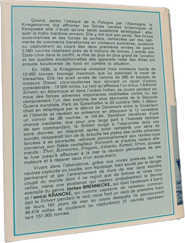 éditions france-empire 1978 in8. 1978. Cartonné. Ce livre raconte l'exploit du croiseur lourd allemand Admiral Scheer qui pendant six mois en 1940-1941 a mené une campagne de raids dans l'Atlantique et l'océan Indien échappant aux forces alliées et coulant ou capturant 21 navires. Le récit est co-écrit par le commandant du navire Theodor Krancke et un de ses officiers Jochem Brennecke offrant un témoignage de première main sur cette opération de la Kriegsmarine