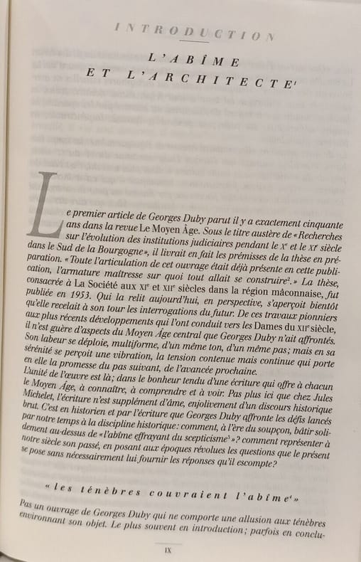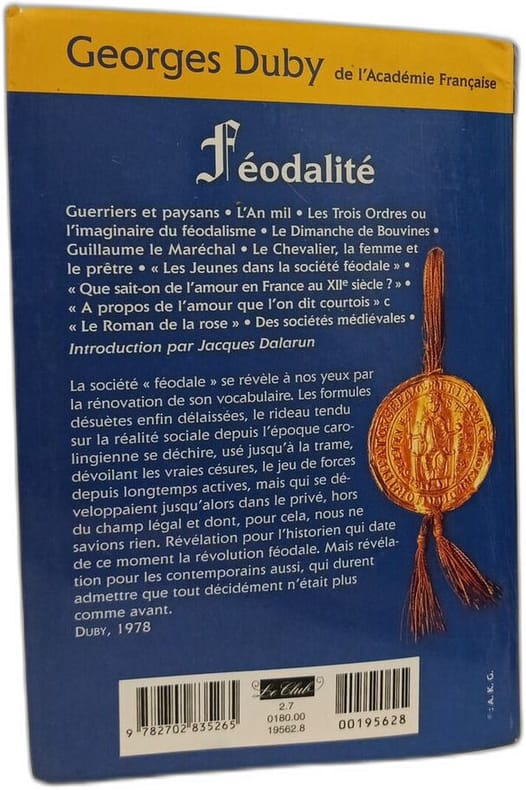Le Club 1996 1523 pages in8. 1996. Broché avec une illustration. 1523 pages. Ouvrage majeur de l'historien médiéviste Georges Duby analysant la société féodale à travers l'évolution de son vocabulaire et des structures sociales. Le livre présente la 'révolution féodale' comme un tournant historique et reflète l'approche de l'école des Annales mêlant rigueur académique et accessibilité pour le grand public