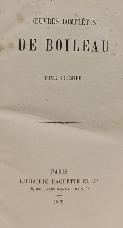 Librairie Hachette et Cie 1875 in12. 1875. Relié. Cette édition des œuvres complètes de Nicolas Boileau (Boileau-Despréaux) est une édition critique collationnée sur les anciennes éditions et manuscrits. Elle est accompagnée de notes historiques et littéraires ainsi que de recherches sur la vie la famille et les ouvrages de l'auteur