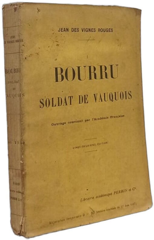 Librairie académique Perrin et Cie 1916 in12. 1916. Broché. Bourru soldat de Vauquois est un roman de Jean des Vignes Rouges publié en 1921. Il raconte l'histoire de Bourru un vigneron bourguignon stylisé en soldat-type et décrit les expériences de la 10e division et du 31e régiment d'infanterie notamment lors des attaques de Vauquois en février-mars 1915 ainsi que les seize mois suivants. L'ouvrage présenté comme une œuvre réellement vécue se termine par un résumé des opérations de guerre à Vauquois et vise à faire comprendre la réalité de la guerre de tranchées et de mines