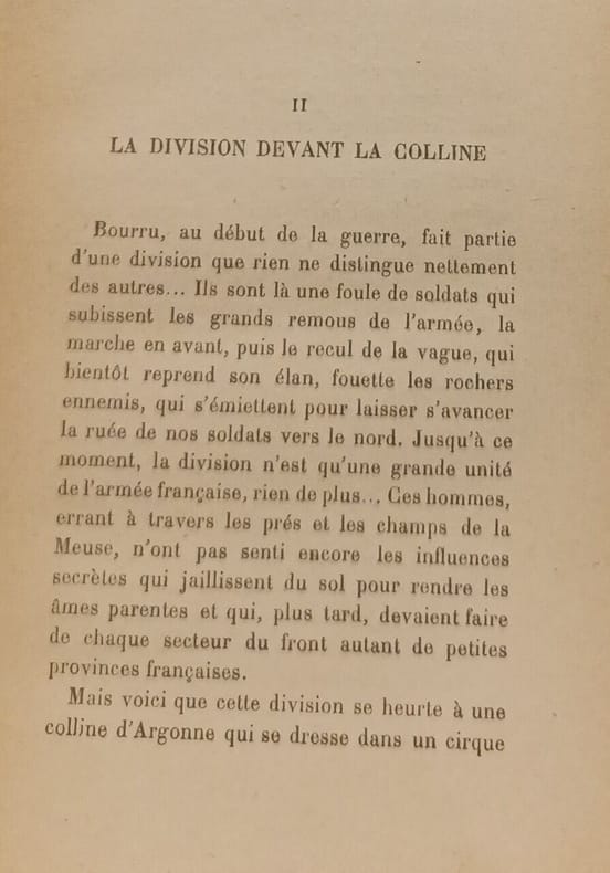 Récit romancé : "Bourru est un soldat-type, stylisé... c'est un vigneron bourguignon de Bligny, village natal de l'auteur. Son roman raconte la 10e division et le 31e RI, en particulier lors des attaques de Vauquois en février-mars 1915 et dépeint brièvement les 16 mois qui suivirent." (Norton Cru)