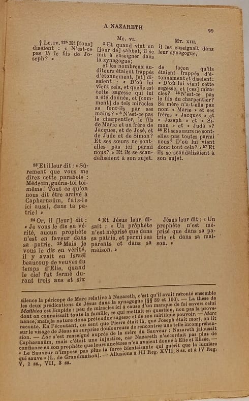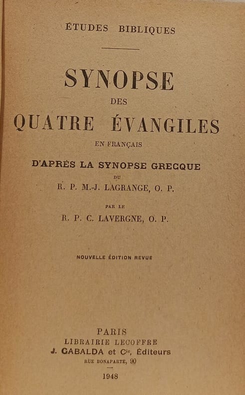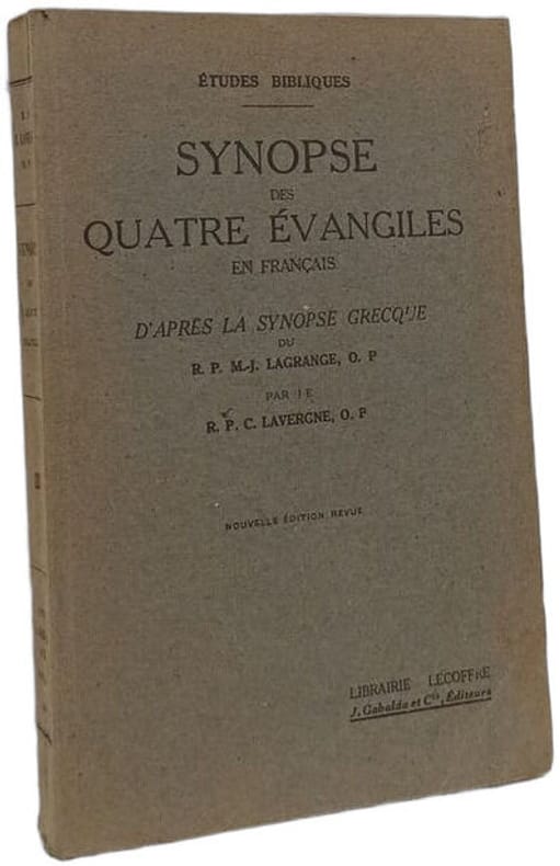 J. Gabalda et Cie Éditeurs 1948 in12. 1948. Broché. Cet ouvrage est une synopse des quatre Évangiles en français basée sur la synopse grecque originale du père Marie-Joseph Lagrange. Il présente les textes évangéliques en colonnes parallèles pour faciliter la comparaison des passages correspondants avec des traductions et commentaires visant à mettre en lumière les relations entre les Évangiles et la conception historique de leur auteur