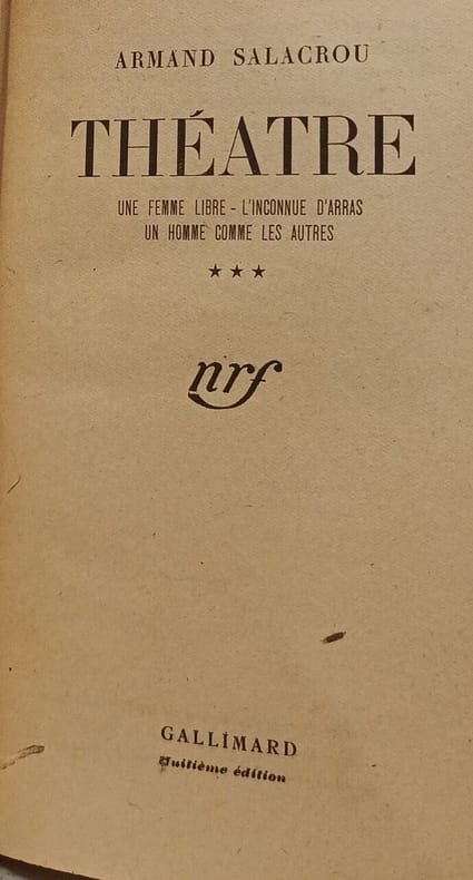 GALLIMARD 1943 in12. 1943. Relié. Ce volume rassemble trois pièces de théâtre d'Armand Salacrou dont 'Une femme libre' et 'L'Inconnue d'Arras'. 'L'Inconnue d'Arras' est une pièce étrange mais passionnante aux dialogues brillants et d'une écriture fine offrant une puissante analyse du caractère humain. Elle est régulièrement reprise dans le monde