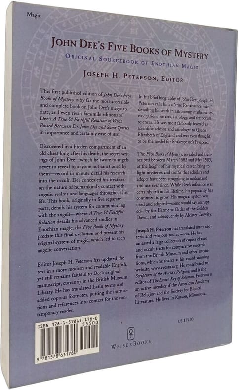 Weiser Books 2003 544 pages 17 6x25 3x2 6cm. 2003. Broché. 544 pages. Il s'agit d'une édition critique compilée et éditée par Joseph H. Peterson des cinq livres mystérieux de John Dee constituant la source originale de la magie énochienne. L'ouvrage présente les recherches magiques et occultes de Dee un érudit de la Renaissance dans une édition soignée précédemment publiée dans la série Magnum Opus Hermetic Sourceworks