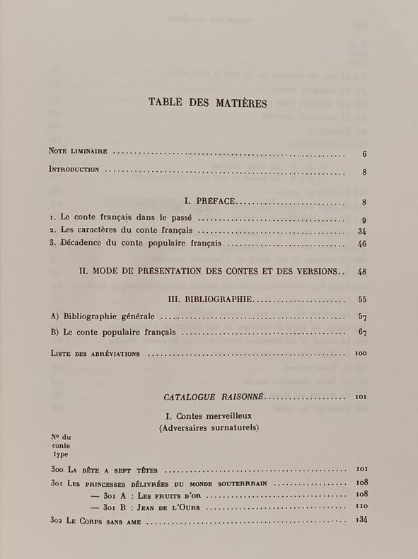 Maisonneuve & Larose. Edit. Maisonneuve et Larose, 1957-1976. 3 tomes en quatre volumes , in-4 reliés demi-chagrin fauve, couvertures conservées. T. 1 : 394- T. 2* et T. 2 ** : 729 pages - T. 3 : 507 pages. abréviations, bibliographie, appendices.Ce Catalogue raisonné des versions de France et des pays de langue française d'outre-mer est un ouvrage initié par Paul Delarue et continué par Marie-Louise Tenèze. S'appuyant sur la classification dite de Aarne et Thompson (basée sur le concept de conte-type) élaborée par le folkloriste finlandais Antti Aarne en 1910, ce livre recense et classe des contes populaires recueillis sur tout le territoire français (Métropole, Antilles françaises, La Réunion), ainsi que dans des pays de langue française d'outre-mer (Canada, Louisiane, Îlots francophones des États-Unis, Haïti, Île Maurice). Complet en 4 volumes, très bon état.