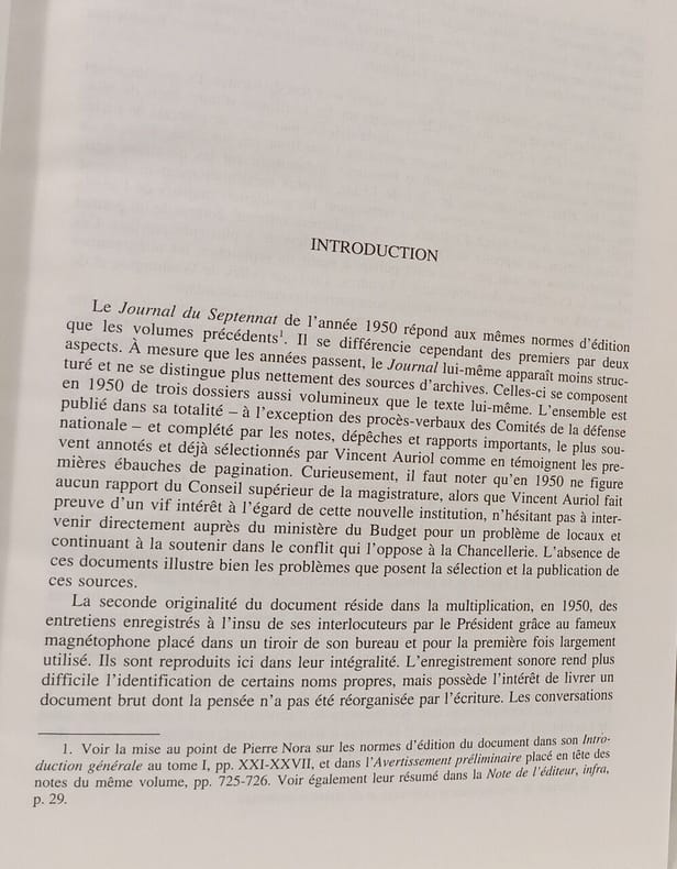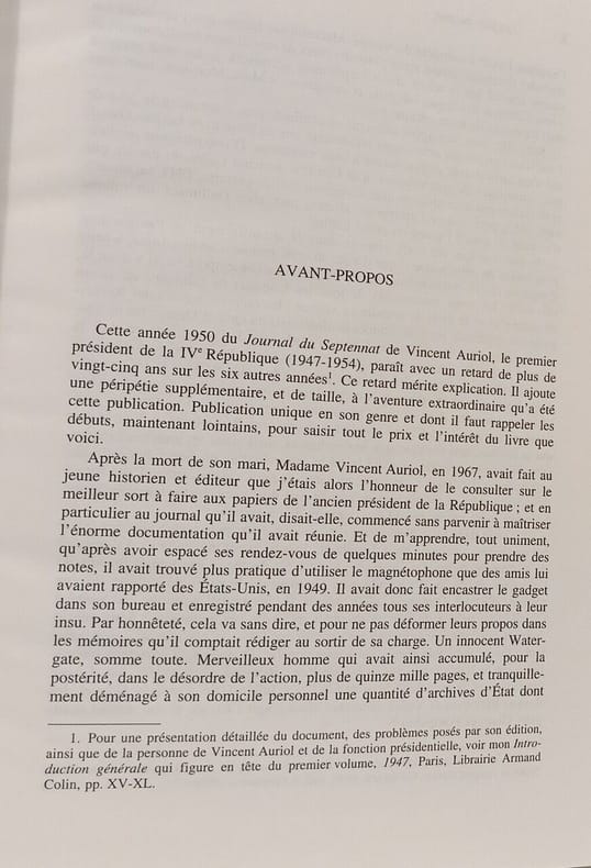 TALLANDIER 2004 15x4x25cm. 2004. Cartonné. Il s'agit de l'édition critique du journal tenu par le président Vincent Auriol durant son mandat (1947-1954) présenté et annoté par Pierre Nora et Jacques Ozouf. L'ouvrage constitue une source historique majeure pour comprendre la vie politique de la Quatrième République