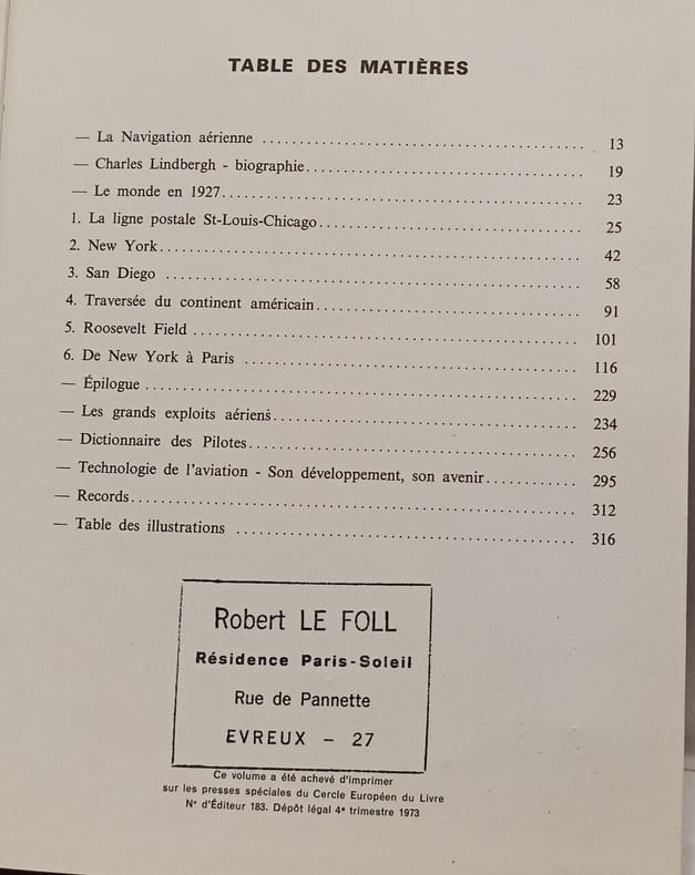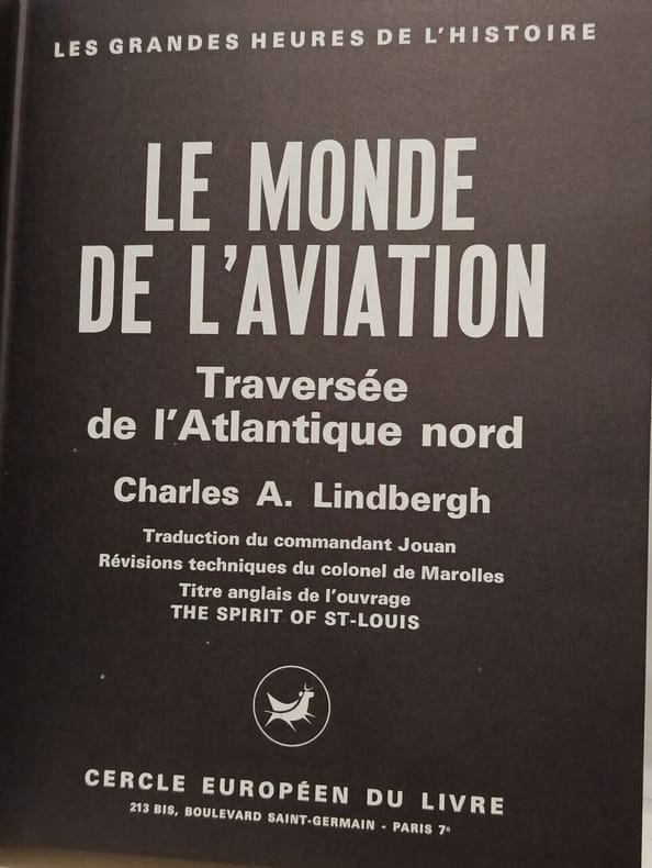 Cercle Européen du Livre, 1973, gr. in-8°, 316 pp, traduction du commandant Jouan, révisions techniques du colonel de Marolles, titre anglais de l'ouvrage : The Spirit of St Louis, texte sur 2 colonnes, illustré de 229 gravures et photos, reliure simili-cuir bordeaux de l'éditeur, dos et 1er plat ornés, rhodoïd, bon état (Coll. Les Grandes Heures de l'Histoire)