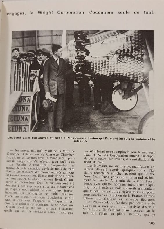Réédition de “Trente-trois heures pour Paris” [“The Spirit of St-Louis”] sous un nouveau titre, augmenté de chapitres sur les grands exploits aériens, la technologie de l'aviation, d'un dictionnaire des pilotes et de très nombreuses gravures et photos. — Le 21 mai 1927 Charles Lindbergh (1902-1974) atterrissait au Bourget, réalisant ainsi la première traversée de l'Atlantique nord sans escale. Profitant de l'enthousiasme populaire et de la confusion qui régnait ce soir-là sur l'aéroport, un admirateur indélicat vola le journal de bord du Spirit of Saint-Louis, privant Lindbergh et ses contemporains d'un document « vécu » irremplaçable. L'aviateur mit plus d'une vingtaine d'années pour reconstituer l'enchaînement des événements. L'ouvrage parut finalement en France aux Presses de la Cité en 1953 sous le titre “Trente-trois heures pour Paris”. Mêlant souvenirs d'enfance et récit objectif de la traversée, le livre est particulièrement intéressant.