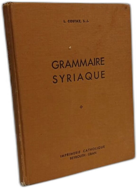 Imprimerie Catholique 1964 in8. 1964. Broché. Grammaire syriaque de Louis Costaz est un manuel de grammaire de la langue syriaque publié en 1964 par l'Imprimerie catholique de Beyrouth. L'ouvrage de 262 pages rédigé en français présente la grammaire de cette langue sémitique ancienne riche d'un important patrimoine littéraire et encore utilisée dans les rites chrétiens orientaux