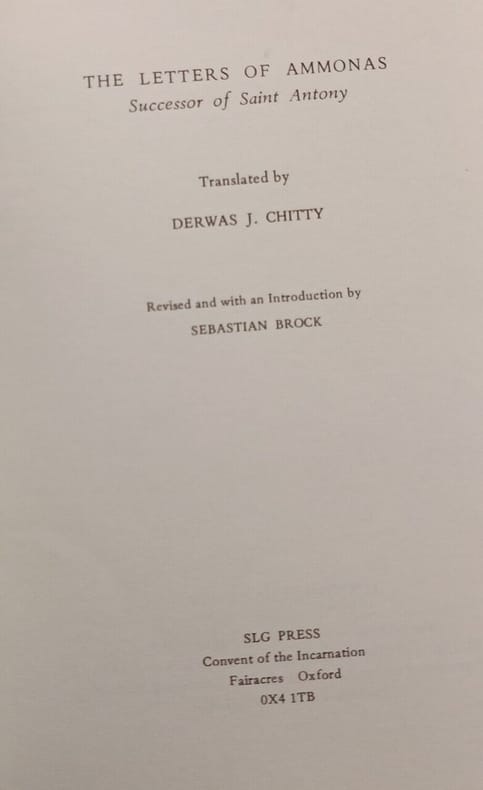 Fairacres Publications 1988 23 pages 13 97x0 76x20 83cm. 1988. Agrafé. 23 pages. Ce livre est une traduction des quatorze lettres survivantes de saint Ammonas disciple et successeur de saint Antoine le Grand. Les lettres abordent principalement les dons de l'Esprit la direction spirituelle et le discernement de la volonté de Dieu. Il s'agit d'une édition révisée avec une introduction publiée par Fairacres Publications