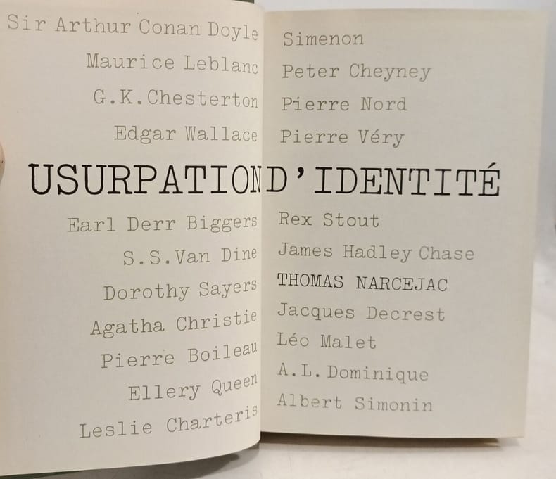 Clp 1959 in8. 1959. Cartonné. Usurpation d'identité est un roman de Pierre Boileau et Thomas Narcejac publié en 2000 (et initialement en 1959 selon une source). Il s'agit d'un recueil de pastiches où les auteurs imitent avec savoir-faire le style des écrivains qui ont marqué le roman policier entre 1880 et 1980. Le livre inclut une préface qui est elle-même un pastiche