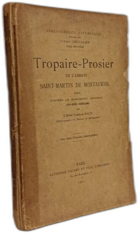 Alphonse Picard et fils 1901 in8. 1901. Broché. Édition critique du tropaire-prosier (recueil de chants liturgiques) de l'abbaye Saint-Martin de Montauriol publiée d'après un manuscrit original datant des XIe-XIIIe siècles. L'ouvrage contient des hymnes répons et antiennes utilisés dans les offices religieux et appartient à la collection Bibliothèque liturgique
