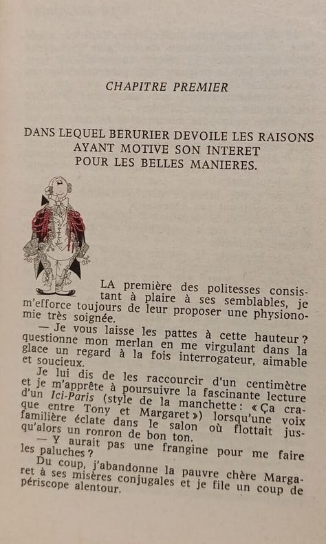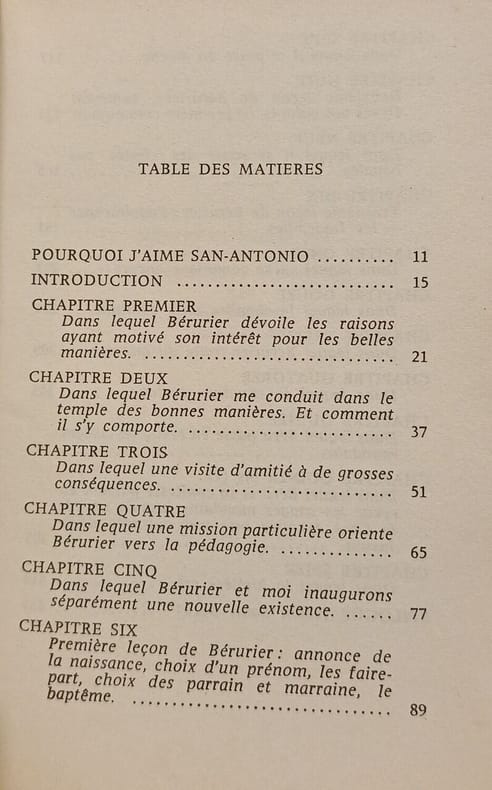 Fleuve Noir 1965 in8. 1965. Cartonné. Le livre est un roman policier humoristique où Bérurier personnage récurrent de la série San-Antonio enseigne le savoir-vivre à sa manière tout en étant impliqué dans une enquête. Lui et San-Antonio doivent déjouer un complot d'attentat contre le président du Ronduras Ramiro Ramirez impliquant des élèves et un gardien de nuit. Le ton est satirique moquant les conventions bourgeoises et les bonnes manières