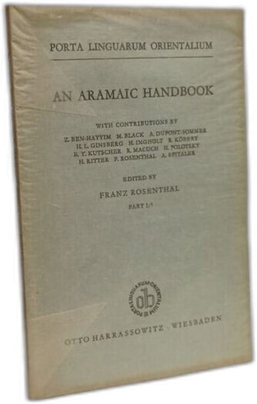 Otto Harrassowitz 1967 in8. 1967. Broché. An Aramaic Handbook est un manuel académique édité par Franz Rosenthal et publié par Otto Harrassowitz présentant un échantillonnage complet de la littérature araméenne depuis les inscriptions anciennes jusqu'aux textes néo-syriaques. L'ouvrage rassemble des contributions de plusieurs spécialistes et constitue une référence pour l'étude des dialectes araméens bien qu'il ne s'agisse pas d'un guide pratique de grammaire