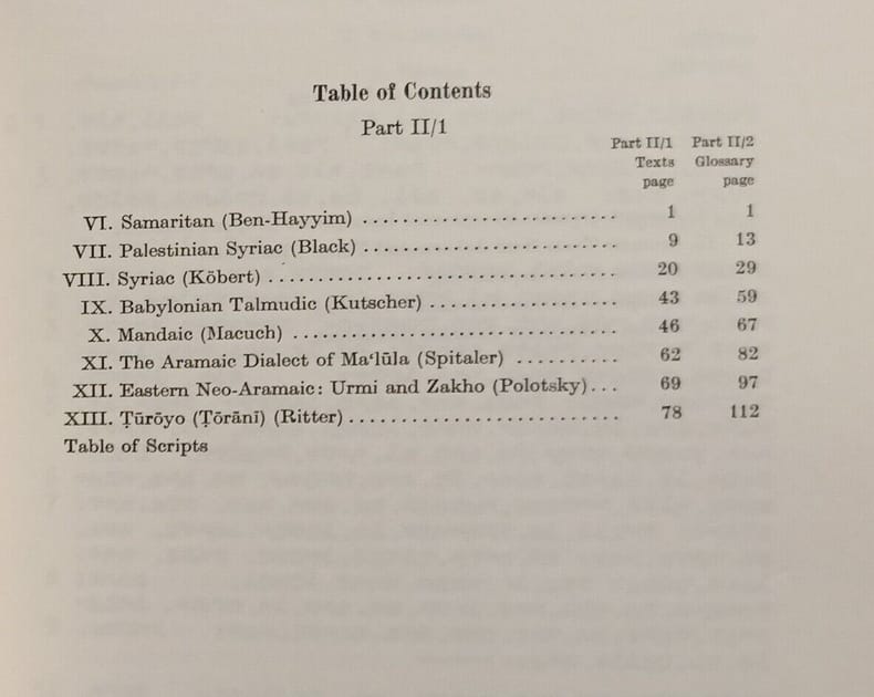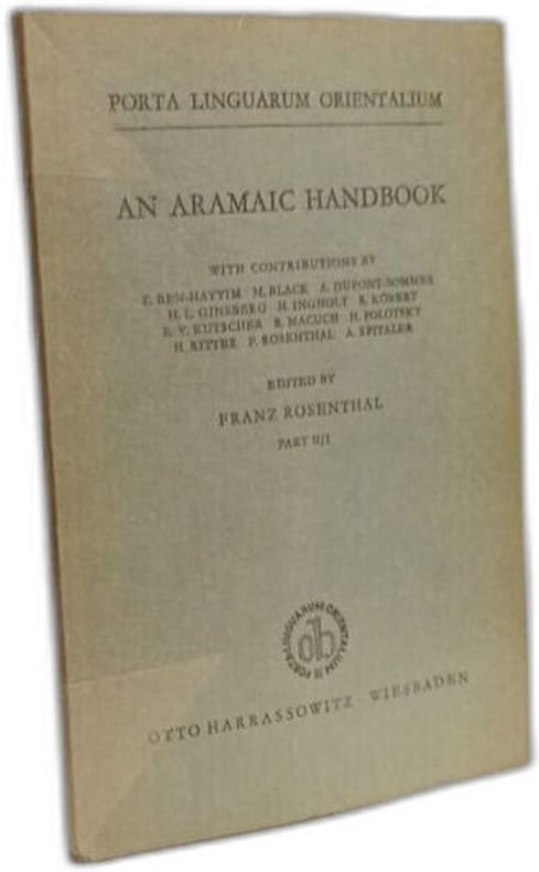 Otto Harrassowitz 1967 in8. 1967. Broché. An Aramaic Handbook est un manuel académique édité par Franz Rosenthal et publié par Otto Harrassowitz présentant un échantillonnage complet de la littérature araméenne depuis les inscriptions anciennes jusqu'aux textes néo-syriaques. L'ouvrage rassemble des contributions de plusieurs spécialistes et constitue une référence pour l'étude des dialectes araméens bien qu'il ne s'agisse pas d'un guide pratique de grammaire
