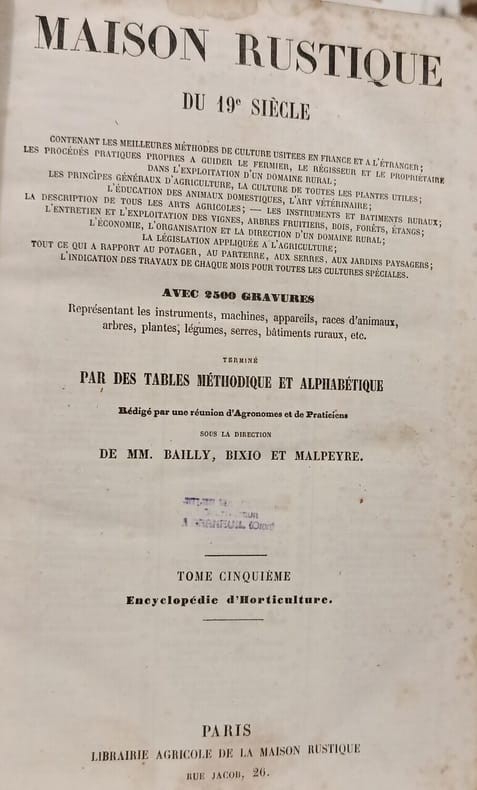 Paris LIBRAIRIE AGRICOLE DE LA MAISON RUSTIQUE 1865 un volume grand in-8°, 680 pp. Reliure en demi-basane bleue, dos lisse orné du titre, de l'année et de tomaison doré.e.s ainsi que de motifs estampés à froid. (dos décoloré et frotté, feuillets faiblement brunis). Texte sur deux colonnes accompagné de 105 figures en noir , de 12 planches en couleurs (chromolithographie) et une planche en noir (plan).