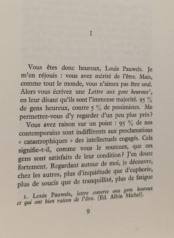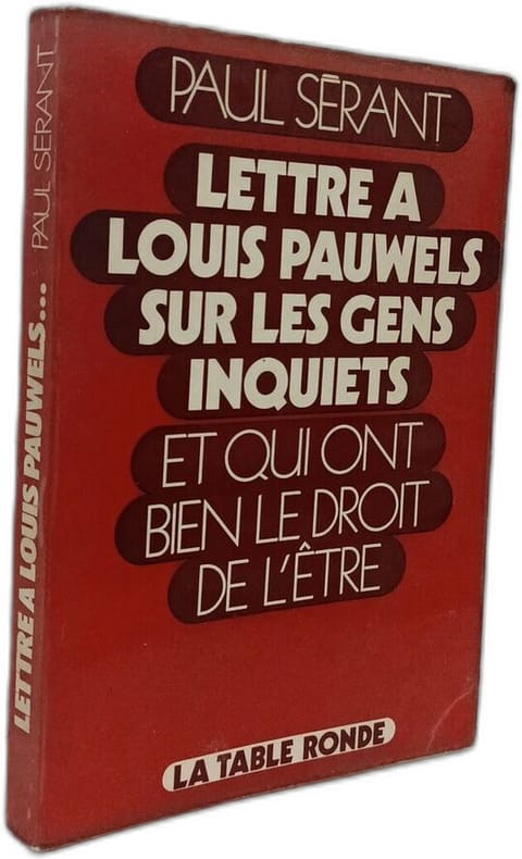 La Table Ronde 1972 in8. 1972. Broché. Dans cette lettre adressée à Louis Pauwels Paul Sérant défend le droit des hommes à l'inquiétude face à un monde où les anciens éléments de stabilité ont disparu. Il critique l'idée de persuader les gens qu'ils sont heureux lorsqu'ils se détournent des meilleures possibilités offertes par la vie estimant cette attitude aussi redoutable que de les convaincre de leur malheur