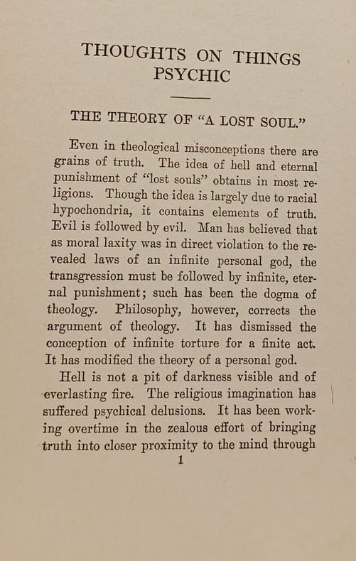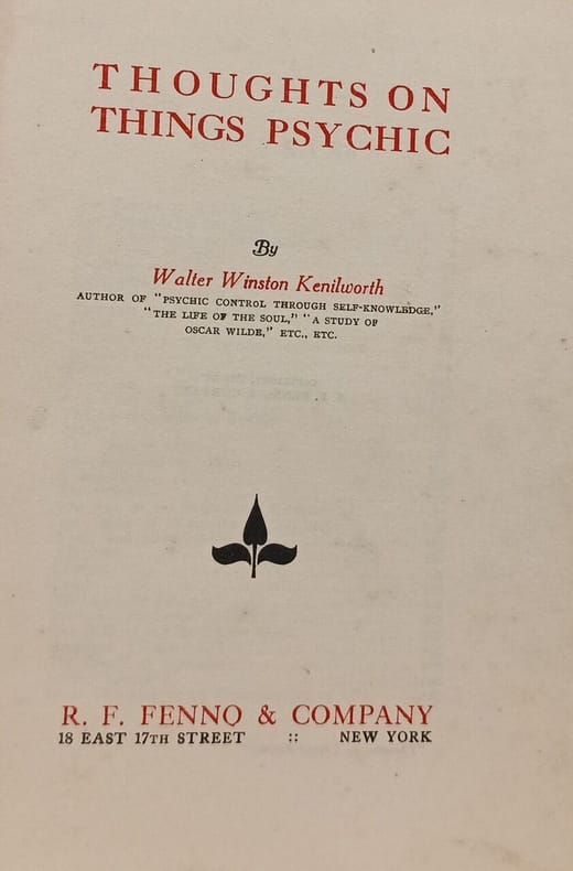 R. F. Fenno & Company 1911 in. 1911. Relié. Thoughts on Things Psychic est un livre de Walter Winston Kenilworth publié en 1911 par R.F. Fenno & Co. qui explore divers phénomènes psychiques comme la télépathie la clairvoyance et la précognition. L'ouvrage présente une collection d'essais et de réflexions basées sur les expériences personnelles et les recherches de l'auteur sur le paranormal