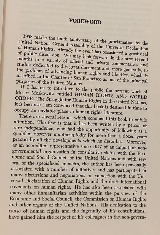 Oceana Publications Inc 1958 in8. 1958. Cartonné. Ouvrage académique de Moses Moskowitz publié en 1958 qui analyse la lutte pour les droits de l'homme au sein des Nations Unies examinant les efforts institutionnels et les défis politiques dans l'établissement d'un ordre mondial fondé sur les droits humains