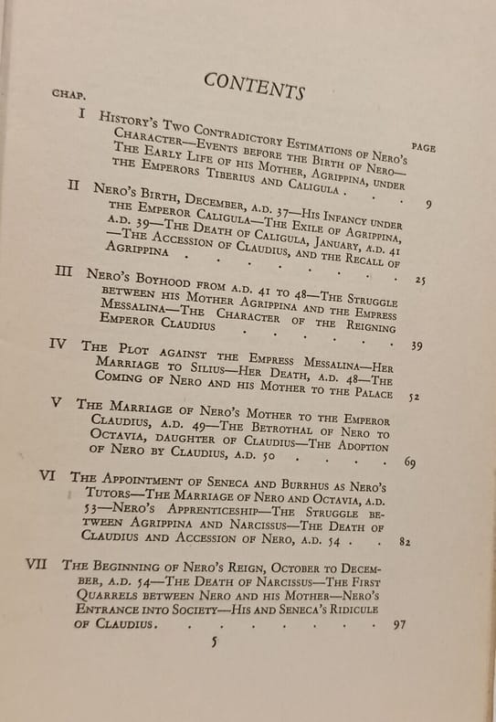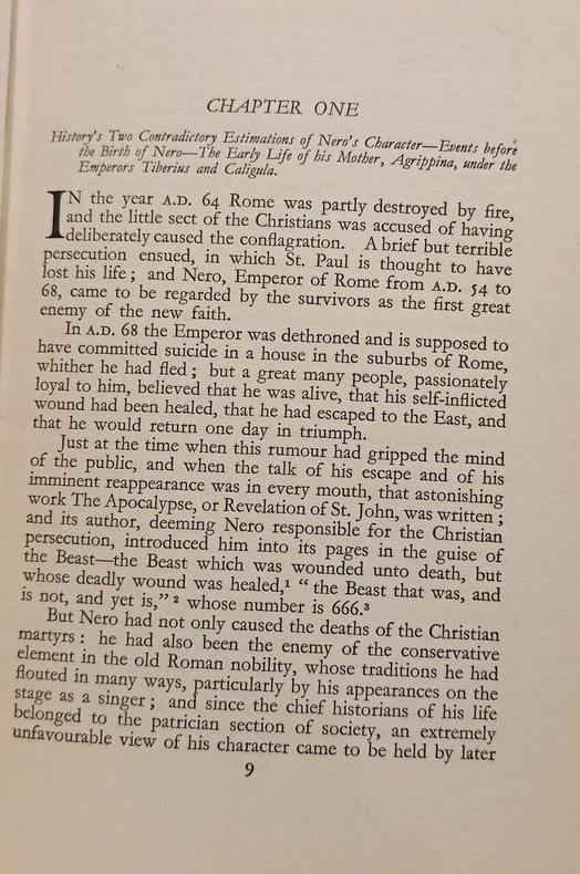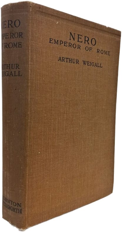 Thornton Butterworth 1930 in8. 1930. Cartonné. Il s'agit d'une biographie historique de l'empereur romain Néron écrite par l'égyptologue et auteur Arthur Weigall. L'ouvrage semble adopter une perspective révisionniste mettant en avant la clémence et la modération de Néron par rapport à d'autres empereurs notamment en citant le faible nombre d'exécutions (18) suite à la conjuration de Pison. Le livre est basé sur les Annales de Tacite (livres XI à XVI)