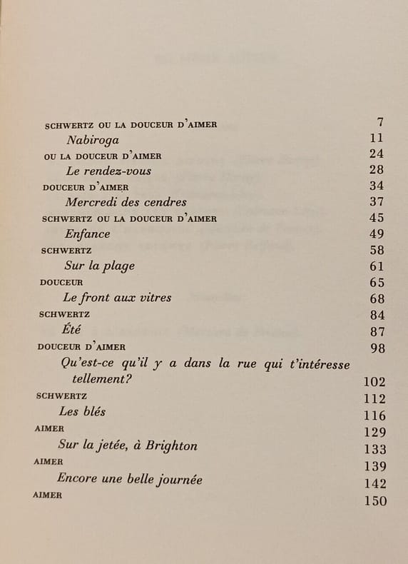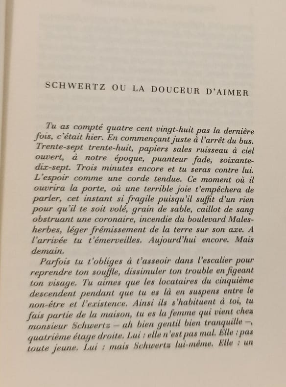 GALLIMARD 1977 in8. 1977. Broché. Recueil de douze nouvelles explorant une relation passionnelle entre un homme nommé Schwertz et une narratrice naviguant aux frontières du vécu et du songe. Le livre présente des séquences où leur amour fou est constamment menacé