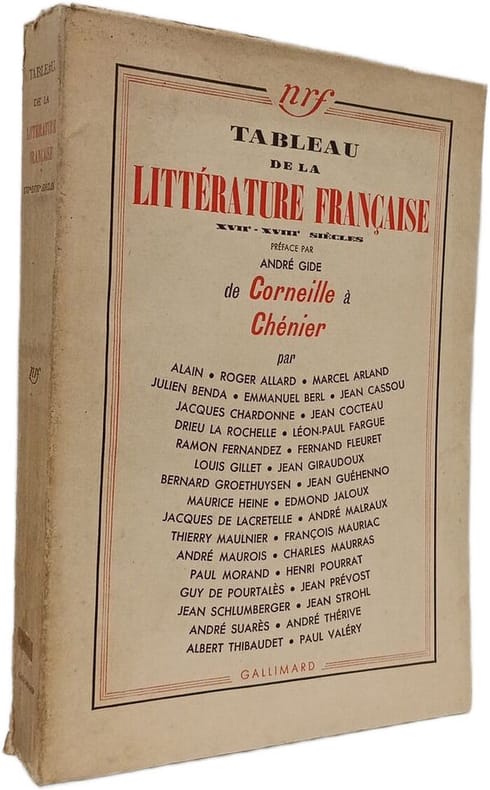Gallimard 1942 in8. 1942. Broché. Le 'Tableau de la littérature française' est une anthologie en deux tomes. Le second tome présenté et préfacé par André Gide couvre la période littéraire allant du XVIIe siècle (à partir de Corneille) jusqu'à la fin du XVIIIe siècle (jusqu'à Chénier). Il s'agit d'un ouvrage de référence publié par Gallimard