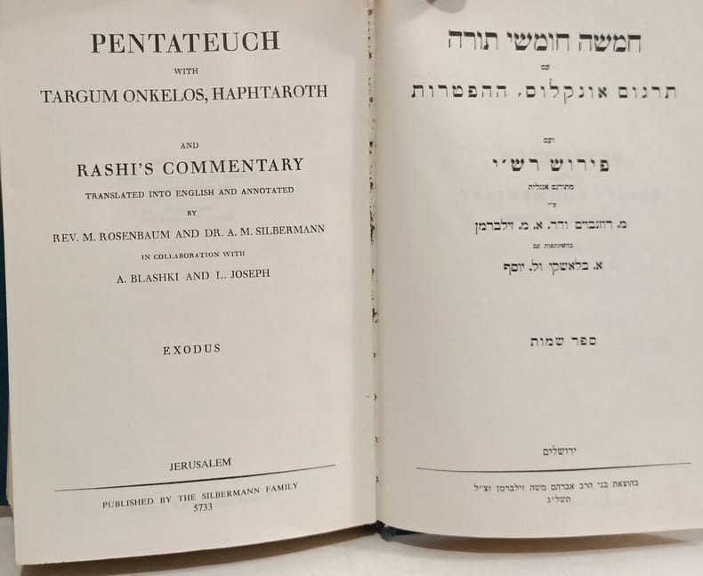 The Silbermann Family in8. Sans date. Cartonné. Il s'agit d'une édition du Pentateuque (les cinq premiers livres de la Bible hébraïque) accompagnée du Targum Onkelos (traduction araméenne) des Haphtaroth (lectures prophétiques) des prières pour le Shabbat et du commentaire de Rashi. L'ouvrage est présenté en plusieurs volumes (Genèse Exode Lévitique Nombres Deutéronome) et comprend des textes en hébreu en araméen et des traductions et annotations en anglais par M. Rosenbaum et A.M. Silbermann avec la collaboration de A. Blashki et L. Joseph