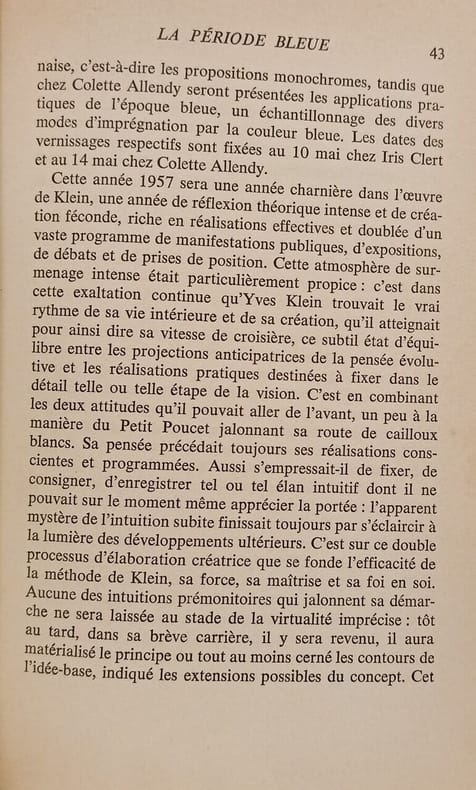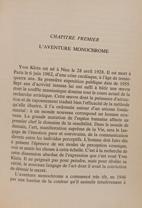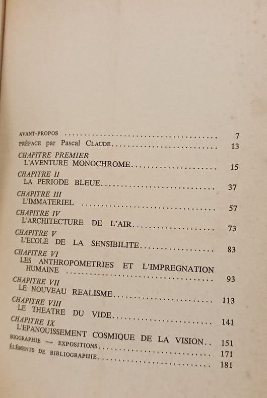 Sommaire : L'aventure monochrome - la période bleue - l'immatériel - l'architecture de l'air - l'école de la sensibilité - les anthropometries et l'impregnation humaine - le nouveau realisme - le theatre du vide - l'épanouissement cosmique de la vision. Classification Dewey : 927-Artistes, sportifs
