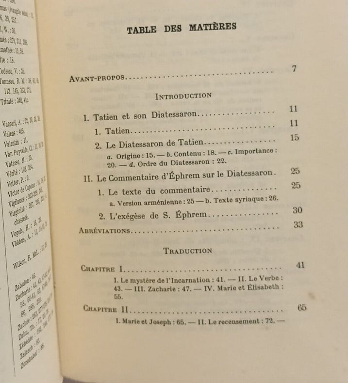 Cerf 1966 in12. 1966. Broché. Le livre est une édition critique du Commentaire sur l'Évangile concordant ou Diatessaron d'Éphrem de Nisibe (v. 306-373). Cette œuvre constitue un témoin majeur du Diatessaron une harmonie des quatre Évangiles composée par Tatien vers 175-180 dont le texte original est perdu. L'ouvrage présente la traduction du commentaire à partir de ses versions syriaque et arménienne accompagnée d'une introduction et de notes par Louis Leloir