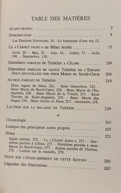 L'ouvrage s'agrémente de quelques cahiers photographiques. ''"Je ne meurs pas, j'entre dans la vie". Cette phrase de Thérèse de Lisieux dans une de ses dernières lettres exprime la foi qui l'anime pendant sa longue et douloureuse maladie. Les "derniers entretiens" avec ses soeurs révèlent ce que furent ces cinq mois de souffrance transfigurés par une espérance infinie et toute simple. C'est Thérèse elle-même qui nous parle : elle nous montre comment souffre, aime et meurt une sainte. Une sainte affectueuse, qui n'a pas peur d'aimer sa famille ; une sainte qui, dans les moments les plus douloureux, tenaillée par le doute, sait plaisanter et garder l'humour. Une sainte toujours amoureuse de Dieu, et héroïque, dont le message plein de réalisme et d'optimisme est capable d'entraîner ceux qui souffrent, mais aussi, simplement, ceux qui vivent.'' Une petite tâche en gouttière. Du reste, très belle condition.
