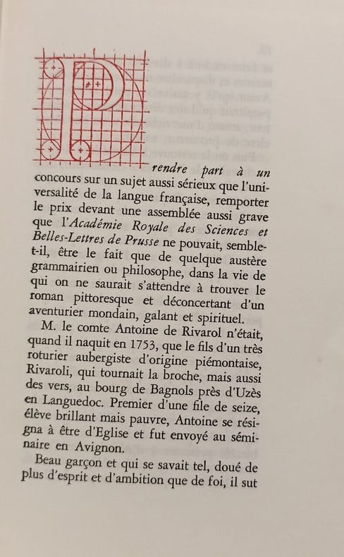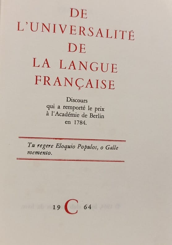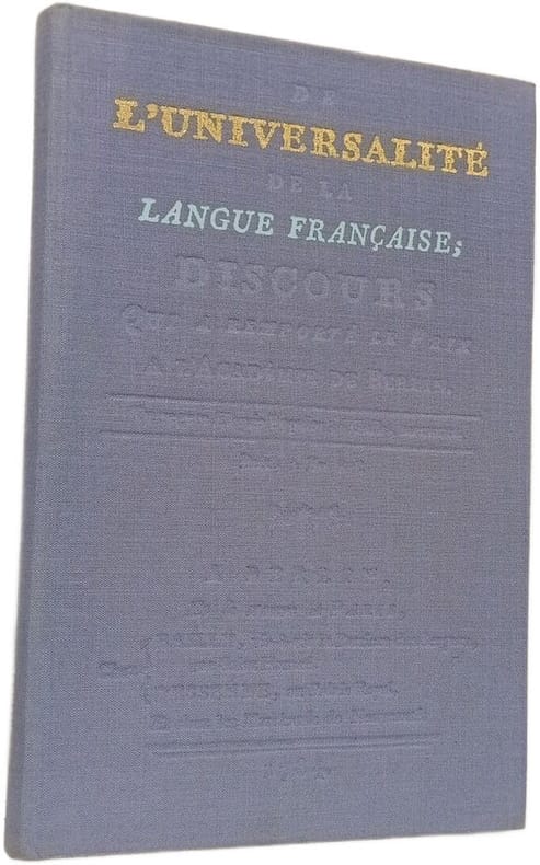 Le club français du livre 1964 in8. 1964. Cartonné. Le 'Discours sur l'universalité de la langue française' d'Antoine de Rivarol est un essai couronné par l'Académie de Berlin en 1784. L'auteur y présente les langues dominantes de l'Europe pour démontrer pourquoi aucune ne peut remplacer le français en établissant une réflexion sur l'histoire et les caractéristiques nationales qui façonnent une langue