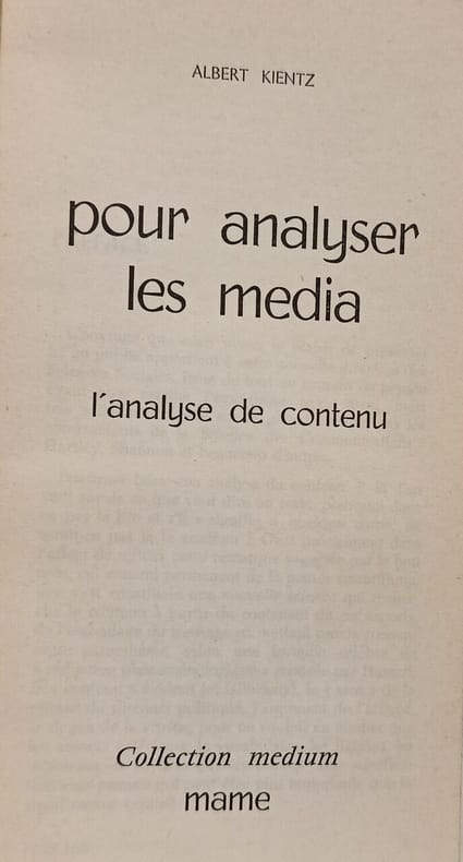 Mame 1971 in8. 1971. Broché. Ouvrage méthodologique de 1971 publié par Albert Kientz chez Mame qui traite spécifiquement de l'analyse de contenu appliquée aux médias. Le livre de 175 pages appartient à la collection "Medium Mame" et se présente comme un guide pratique pour analyser les médias