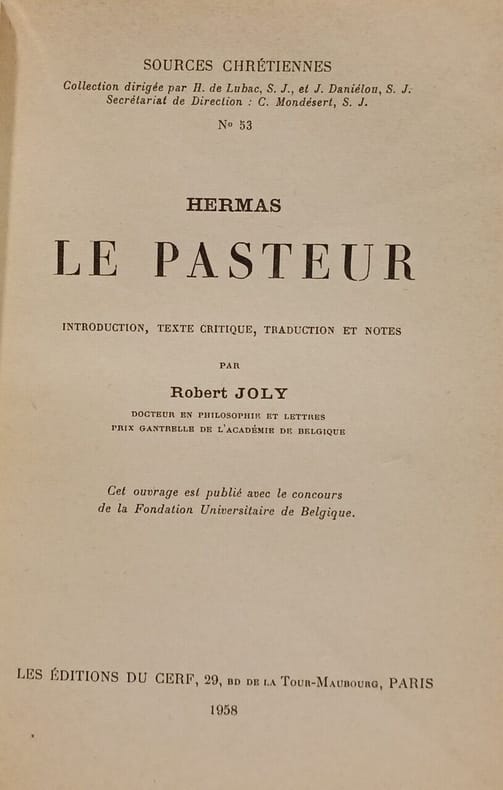 Les Éditions du Cerf 1958 in12. 1958. Broché. Le Pasteur d'Hermas est une œuvre majeure du christianisme du IIe siècle composée probablement à Rome à la fin du Ier ou au début du IIe siècle. Elle relate le parcours initiatique et pénitentiel de l'auteur à travers une série de visions et de paraboles guidé par un ange apparaissant sous la forme d'un pasteur. Le texte offre un développement important sur la morale des premières communautés chrétiennes et illustre une spiritualité ésotérique mêlant judéo-christianisme prédominant et influences hellénistiques
