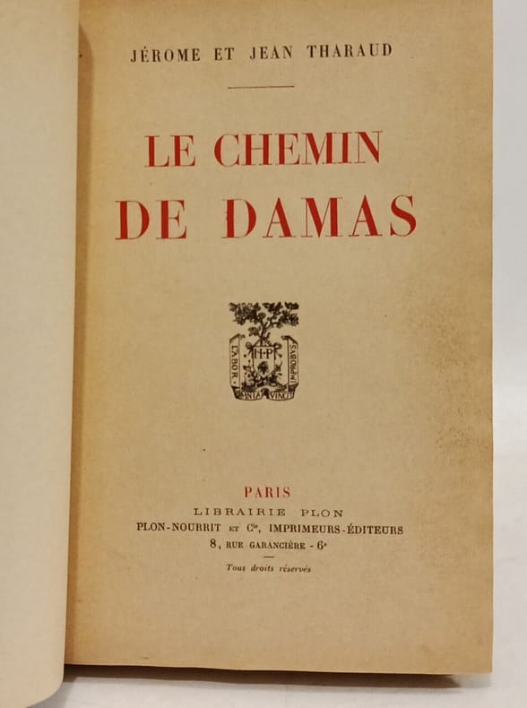 Jérôme et Jean Tharaud, Le Chemin de Damas. Paris, Plon, 1923. In-12, 291p. Edition originale, un des 140 exemplaires sur japon, second papier après 40 chine. Reliure signée Canape et Corriez, demi-maroquin rouge à coins, dos à nerfs, tête dorée, couvertures et dos conservés, non rogné. Bel exemplaire. Jérôme et Jean Tharaud, Le Chemin de Damas. Paris, Plon, 1923. In-12, 291p. Edition originale, un des 140 exemplaires sur japon, second papier après 40 chine. Reliure signée Canape et Corriez, demi-maroquin rouge à coins, dos à nerfs, tête dorée, couvertures et dos conservés, non rogné. Bel exemplaire.