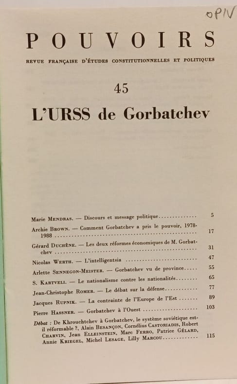 Sommaire : L’URSS de GorbatchevMarie Mendras. — Discours et message politique..Archie Brown. — Comment Gorbatchev a pris le pouvoir, 1978-1988 Gérard DüCHÊNE. — Les deux réformes économiques de M. Gorbatchev Nicolas Werth. — L’intelligentsia ..Ariette Sennegon-Meister. — Gorbatchev vu de province..S. Kartveli. — Le nationalisme contre les nationalités..Jean-Christophe Romer. — Le débat sur la défenseJacques Rupnik. — La contrainte de l’Europe de l’Est.Pierre Hassner. — Gorbatchev à l’Ouest..Débat : De Khrouchtchev à Gorbatchev, le système soviétique est-il réformable ?, Alain Besançon, Cornélius Castoriadis, Robert Charvin, Jean Elleinstein, Marc Ferro, Patrice Gélard, Annie Kriegel, Michel Lesage, Lilly Marcou. Classification Dewey : 70.49-Presse illustrée, magazines, revues