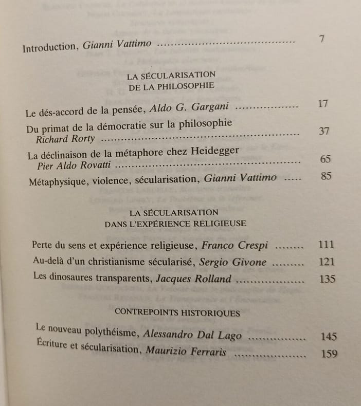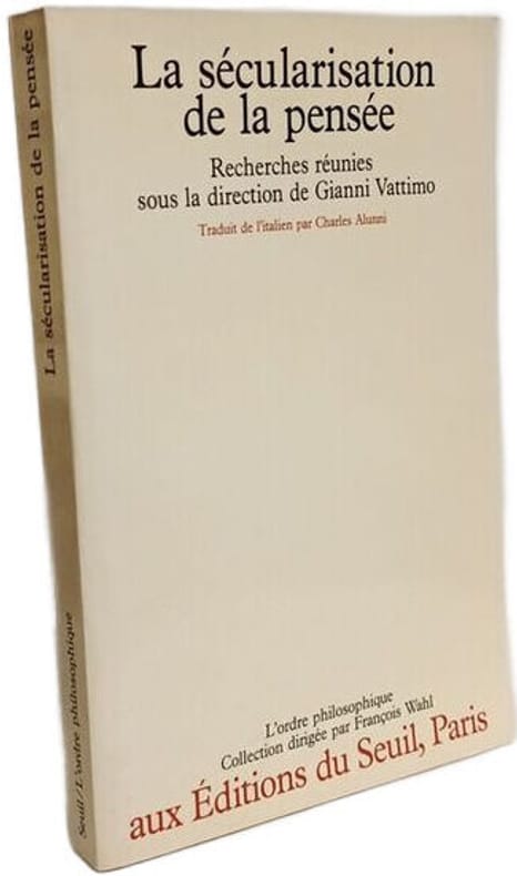SEUIL 1988 224 pages in8. 1988. Broché. 224 pages. Ouvrage collectif dirigé par Gianni Vattimo rassemblant les contributions de dix philosophes (dont H.G. Gadamer) autour du thème de la sécularisation de la pensée. Il s'agit d'une entreprise annuelle de type almanach visant à baliser le travail de réflexion en cours dans ce domaine