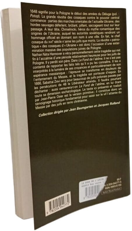 CERF 1991 144 pages 13 4x1 2x21 6cm. 1991. Broché. 144 pages. Chronique de la tragédie des communautés juives lors de l'offensive cosaque de 1648-1650 pendant les guerres cosaco-polonaises. L'ouvrage de Nathan Nata Hannover est présenté comme un témoignage capital sur la vie la souffrance et les espérances messianiques du peuple juif en Europe orientale organisé autour du thème de la persécution (gezerah) touchant à la fois Polonais chrétiens et juifs