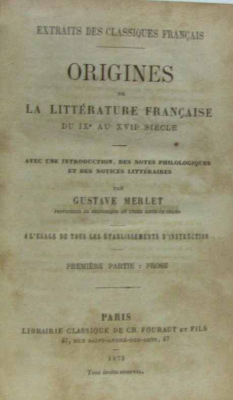 Librairie classique Ch. Fouraut et Fils. 1873. In-12. Cartonnage d'éditeurs. Etat d'usage, Plats abîmés, Dos abîmé, Mouillures. Tome 1 : 558 pp., coins et plats très frottés, dos tâché avec mors fendu en pied du 1er plat, en tête du 2è plat - Tome 2 : 768 pp., piqûres de vers, plats et coins très frottés, dos très frotté. . . . Classification Dewey : 809-Histoire, littérature
