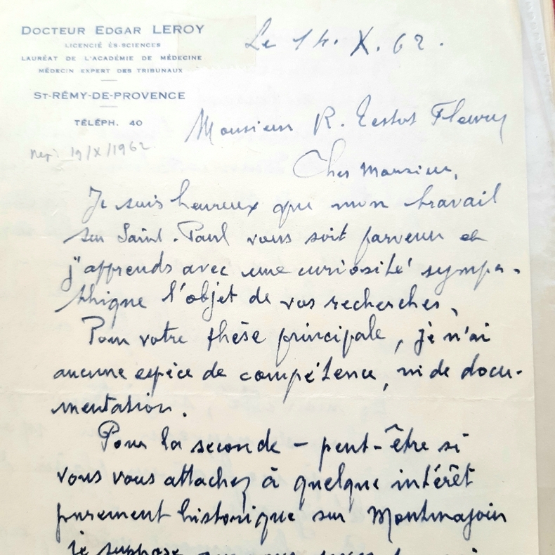 Contient un envoi, une lettre manuscrite signée et adressée à Robert Testat Ferry sur les contacts à prendre pour une thèse en préparation autour de Montmajour, et enfin une petite vue photogr. du Cloître de l’Abbaye de Saint-Paul-de-Mausole. Petites pliures sur les plats mais très bon état intérieur.