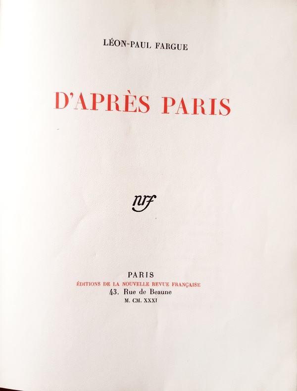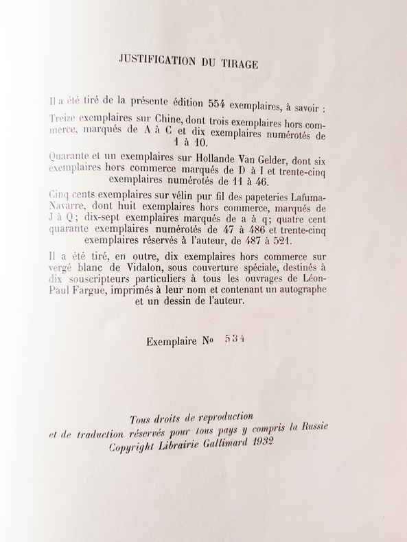Editions de la Nouvelle Revue Française, Paris : 1932 ( 1931 sur la couverture). Exemplaire sur vélin pur fil numéroté ( Tirage total de 564 ex.dont 10 ex. H.C.) In-4 ( 23,7 X19 cm), broché sous couverture grise rempliée. 92 p.p. p. p.