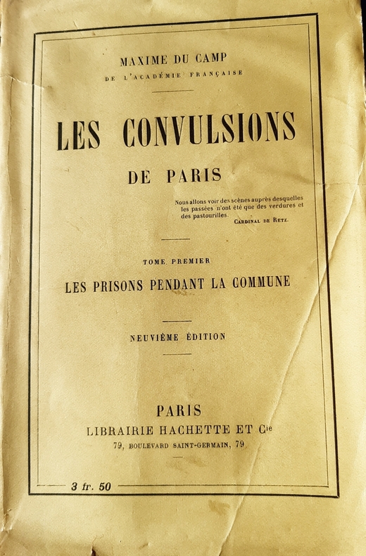 «En 1848, [Du Camp] était à Paris, revenant de son premier voyage en Orient, quand éclata la Révolution. Il se battit contre l'insurrection, aux journées de juin, dans les rangs de la garde nationale, fut blessé et mérita d'être décoré de la main de Cavaignac. C'est de là sans doute que lui vint l'idée d'écrire les Convulsions de Paris, une de ses dernières œuvres, et celle qui restera la plus connue avec Paris, ses organes et ses fonctions.» La Petite Revue, 24 février 1894.