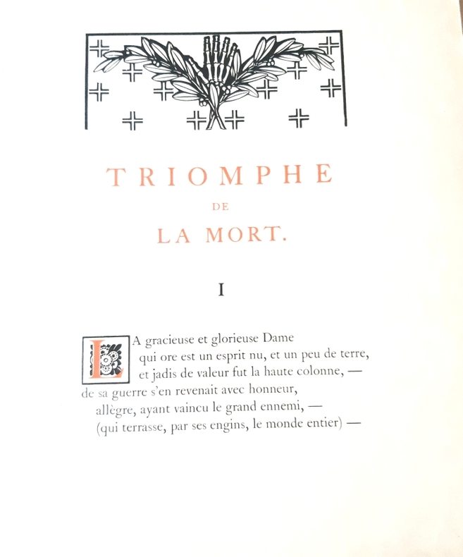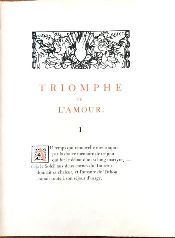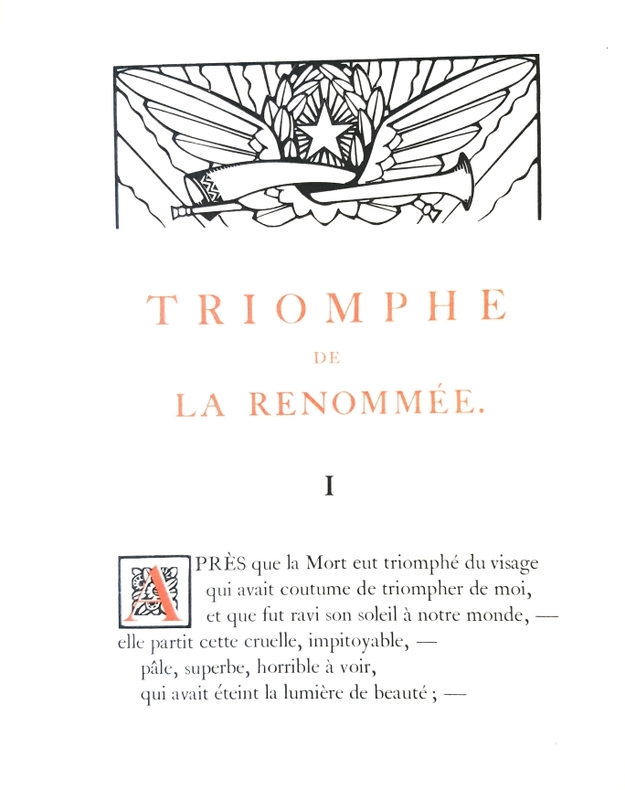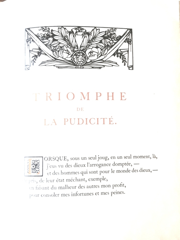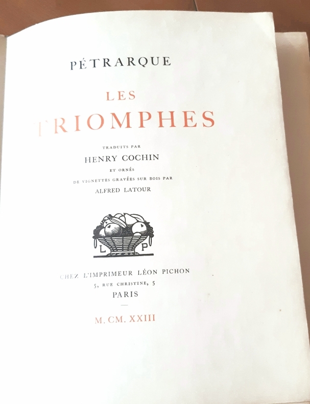 Frontispice et gravures en bandeaux de chaque triomphe. Rares rousseurs marginales sur l'un des feuillets de la suite sur Chine. Petite déchirure marginale sur la couverture. Très bon état intérieur.